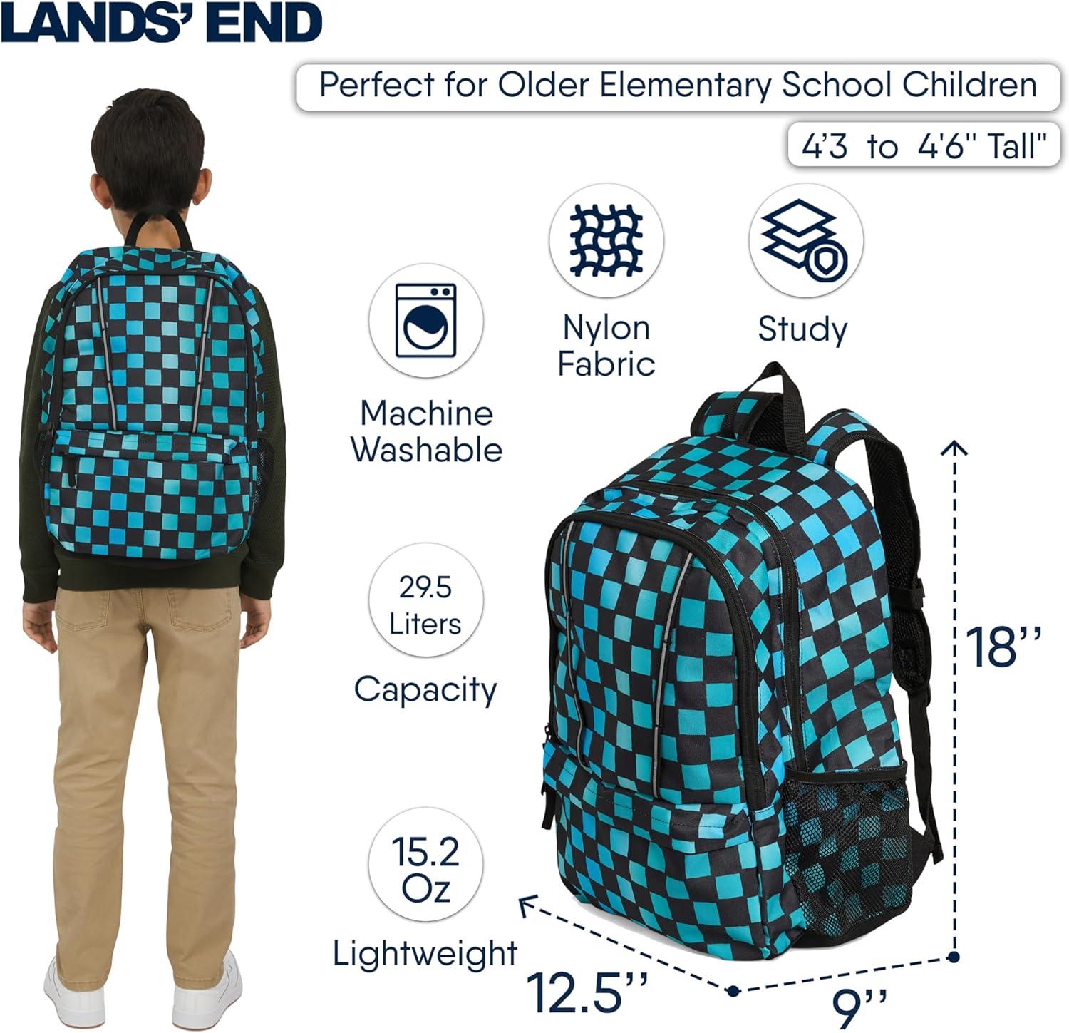 Since 1963, Lands' End has been a trusted name for classic American style, with a brand legacy built on quality and lasting durability. This backpack embodies that unwavering commitment by being the ultimate companion for your child's busy life. Perfectly sized for school, camping, travel, outings, playdates, and sleepovers, its spacious interior easily holds all the essentials. From school supplies and a lunch box to gym clothes, snacks, and toys, this backpack is ready for any adventure. This backpack is built for lasting performance, weighing just 15.2 ounces and made from a sturdy, high-quality reinforced nylon fabric. For a secure and comfortable fit, it features adjustable shoulder straps with PE foam padding and an adjustable chest strap with buckle closure. A reinforced top handle doubles as a convenient hand grip and wall hanger, while high-quality zippers provide easy access to the two-way zippered main compartment, a front pocket, and two mesh side pockets perfect for water bottles. The interior is designed to keep everything safe and organized. It includes a double padded laptop pocket measuring 12″ Wide x 13″ Deep for securely storing a small laptop or tablet, and two utility pockets perfect for holding pens, a small notebook, or a wallet. An interior name tag label is also featured for easy identification. With a generous 29.5 liter capacity (18″ x 12.5″ x 9″), this large backpack is perfectly proportioned for older elementary school children between 4.3' and 4'6″ tall.