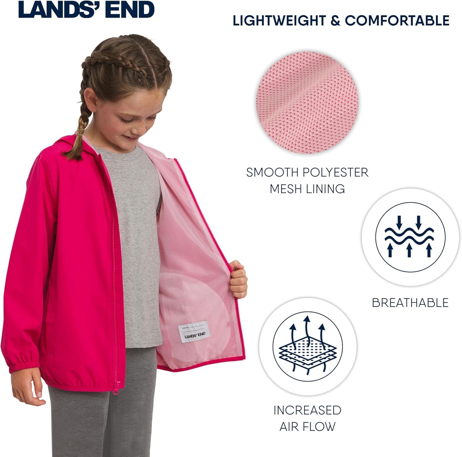 A legacy of timeless quality and dependable design, Lands’ End is committed to crafting comfortable, durable clothing for everyday life. Our jacket embodies that promise, making it a reliable layer for any season. Stay comfortable without the bulk, as this jacket is lightweight and features a smooth mesh lining on the inside that provides breathability and increased airflow. The snug-fit hood has elastic binding and works to keep drafts out, while also providing a comfortable feel. A must-have for changing seasons, this jacket is perfect for windy, rainy, and light chill days. Its durable ripstop shell and water-repellent finish make it a reliable layer for any day. This jacket is also packable, folding neatly into its own back pocket, making it easy to store in a backpack, car, or locker. It pairs perfectly with anything from a tee or hoodie to jeans, joggers, or shorts for a versatile look and is available in a range of colors for both boys and girls. This jacket is designed with convenience and quality in mind. A DWR water-repellent StormRepel finish beads water to keep you dry, while a full-length zipper closure provides a secure fit. The fixed hood provides extra protection when you need it, and two mesh-lined side pockets are perfect for small items. A name tag label and locker loop add to the thoughtful design, while the entire jacket is machine washable for easy care.