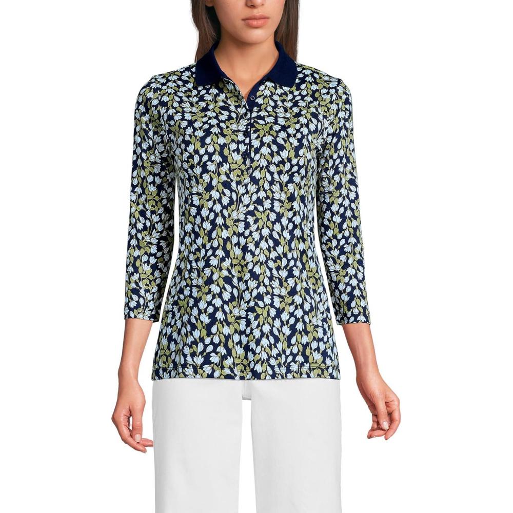 Lands’ End Women’s 3/4 Sleeve American-Grown Supima Cotton Polo Shirt(Navy Mini Bloom Floral)