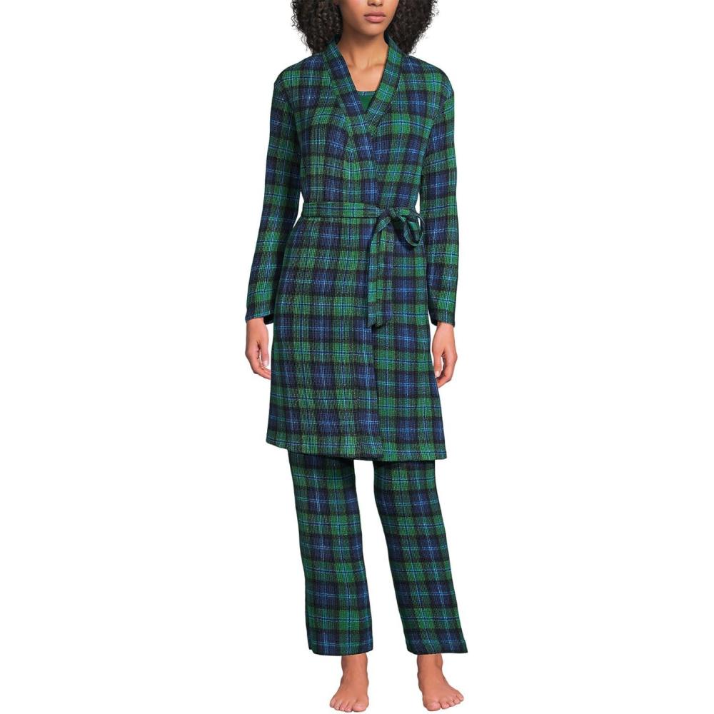 Lands’ End Women’s Brushed Cozy Waffle Jersey 3 Piece Pajama Set – Tank Top Pant and Robe(Light Emerald Blackwatch)