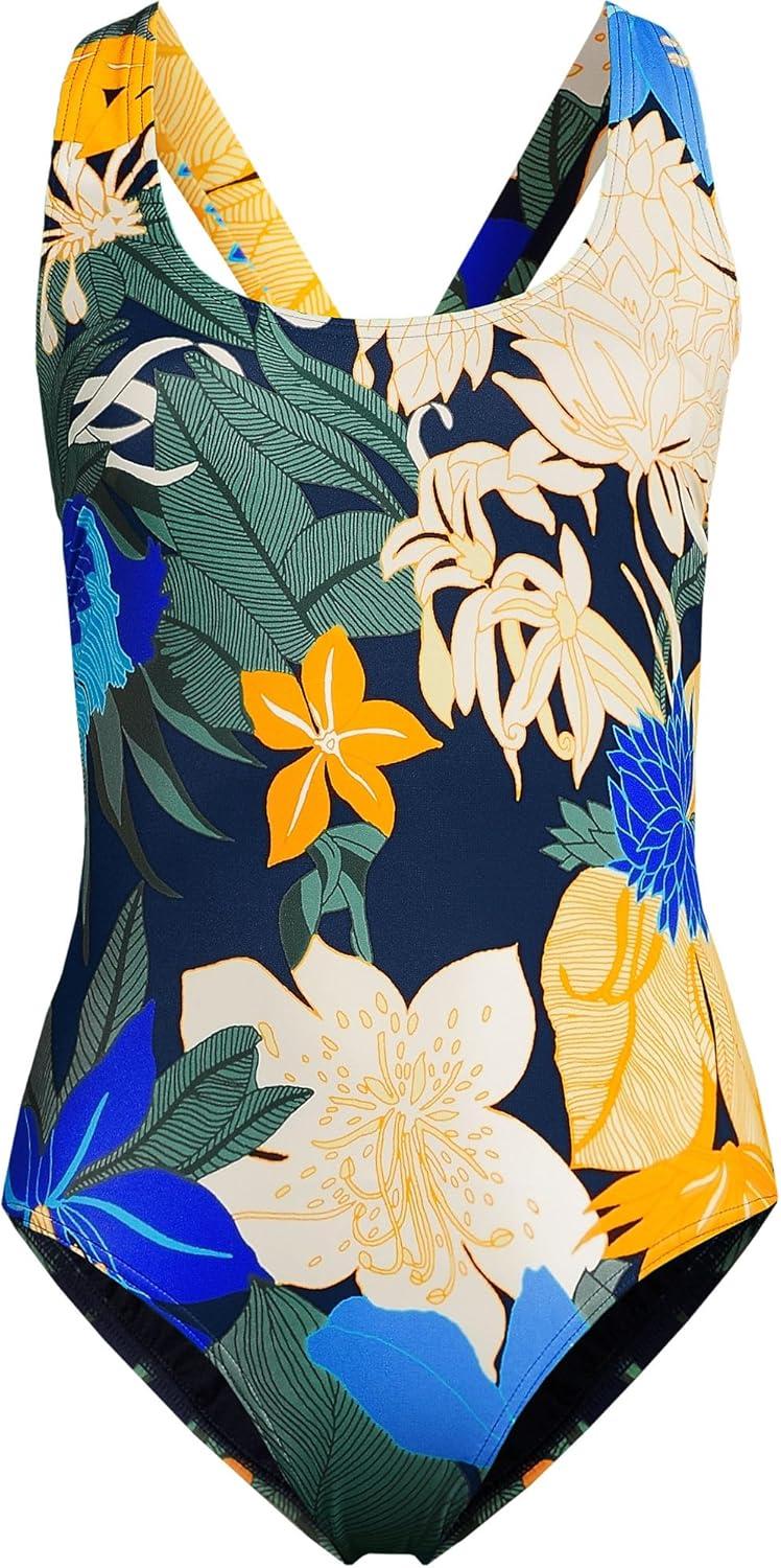 Lands’ End Women’s Chlorine Resistant Scoop Neck X-Back High Leg Soft Cup Tugless Sporty One Piece Swimsuit(Navy Multi Floral Blooms)