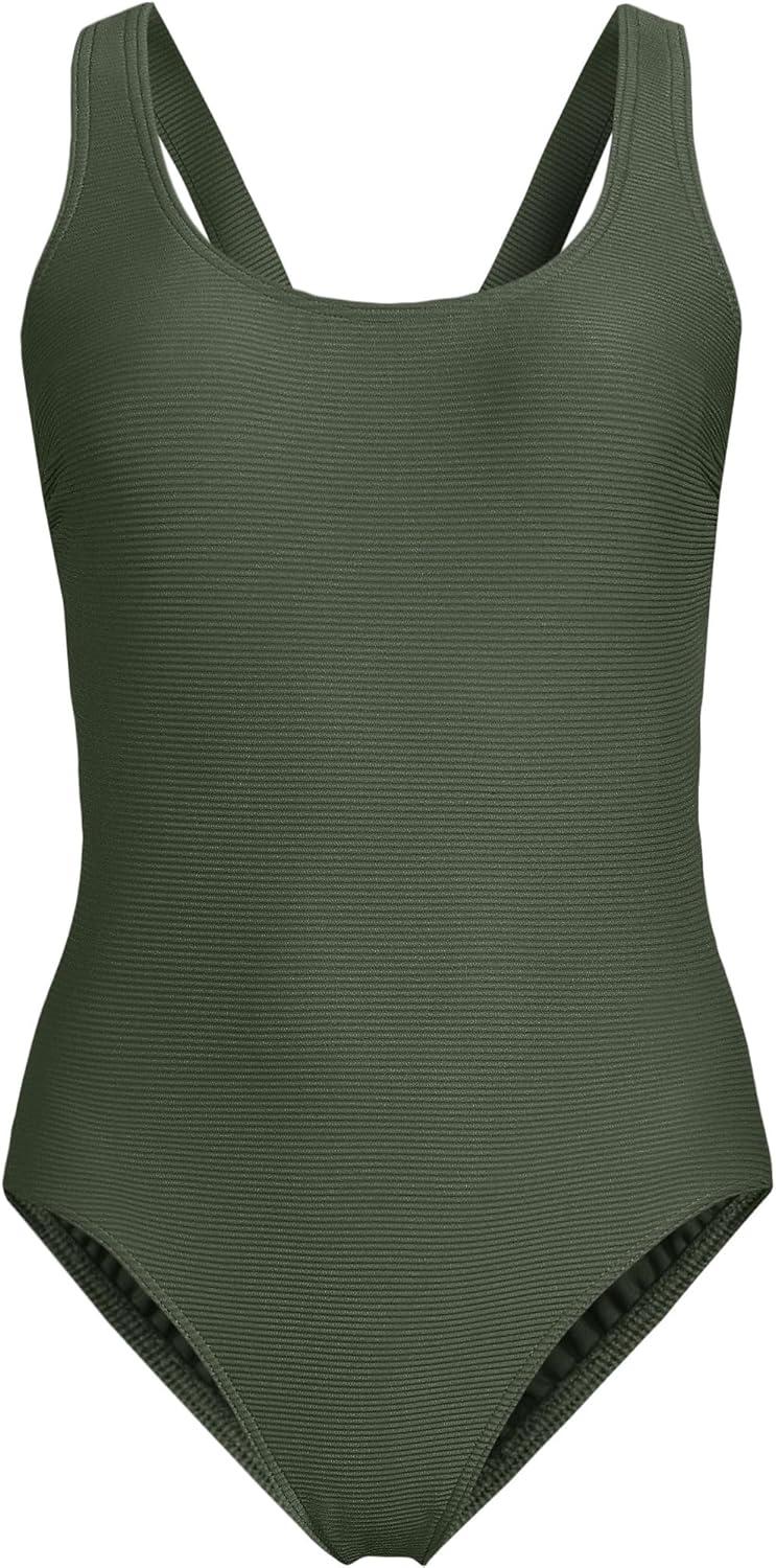 Lands’ End Women’s Chlorine Resistant Scoop Neck X-Back High Leg Soft Cup Tugless Sporty One Piece Swimsuit(Rich Olive Green Ottoman)