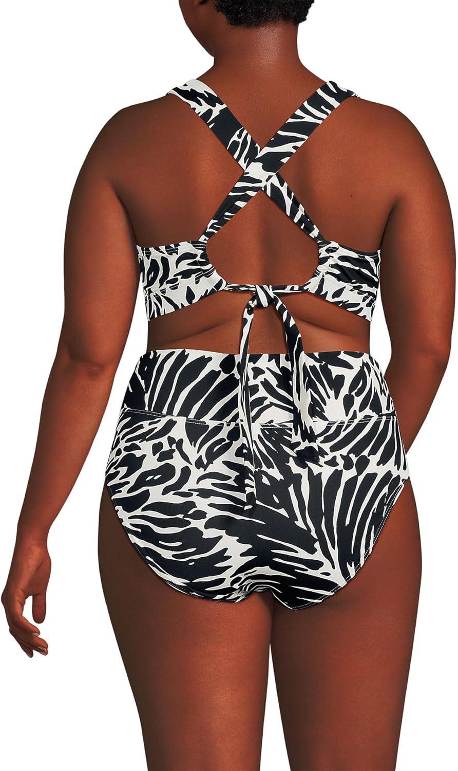 Lands’ End Women’s Chlorine Resistant V-Neck Midkini Swimsuit Top and High Leg High Waisted Bottoms 2 Piece Set(Black/Egret White Leaf Scroll)