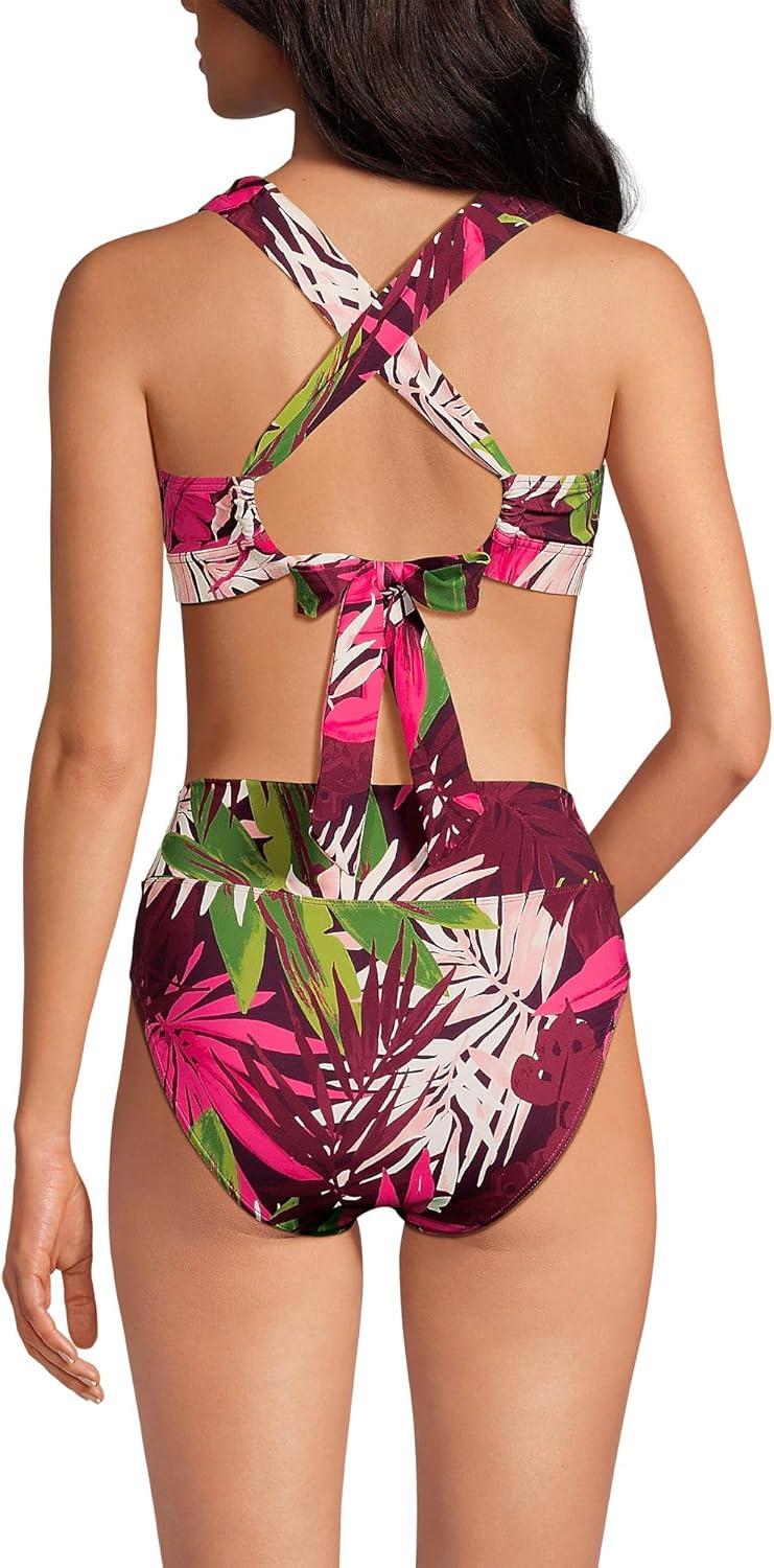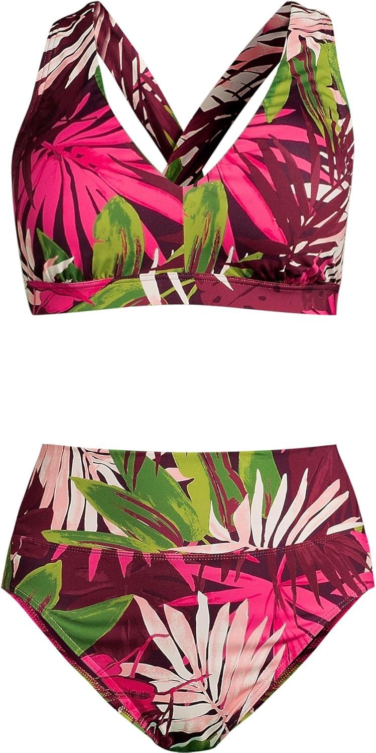 Lands’ End Women’s Chlorine Resistant V-Neck Midkini Swimsuit Top and High Leg High Waisted Bottoms 2 Piece Set(Dark Wine Multi Tropical Palm)