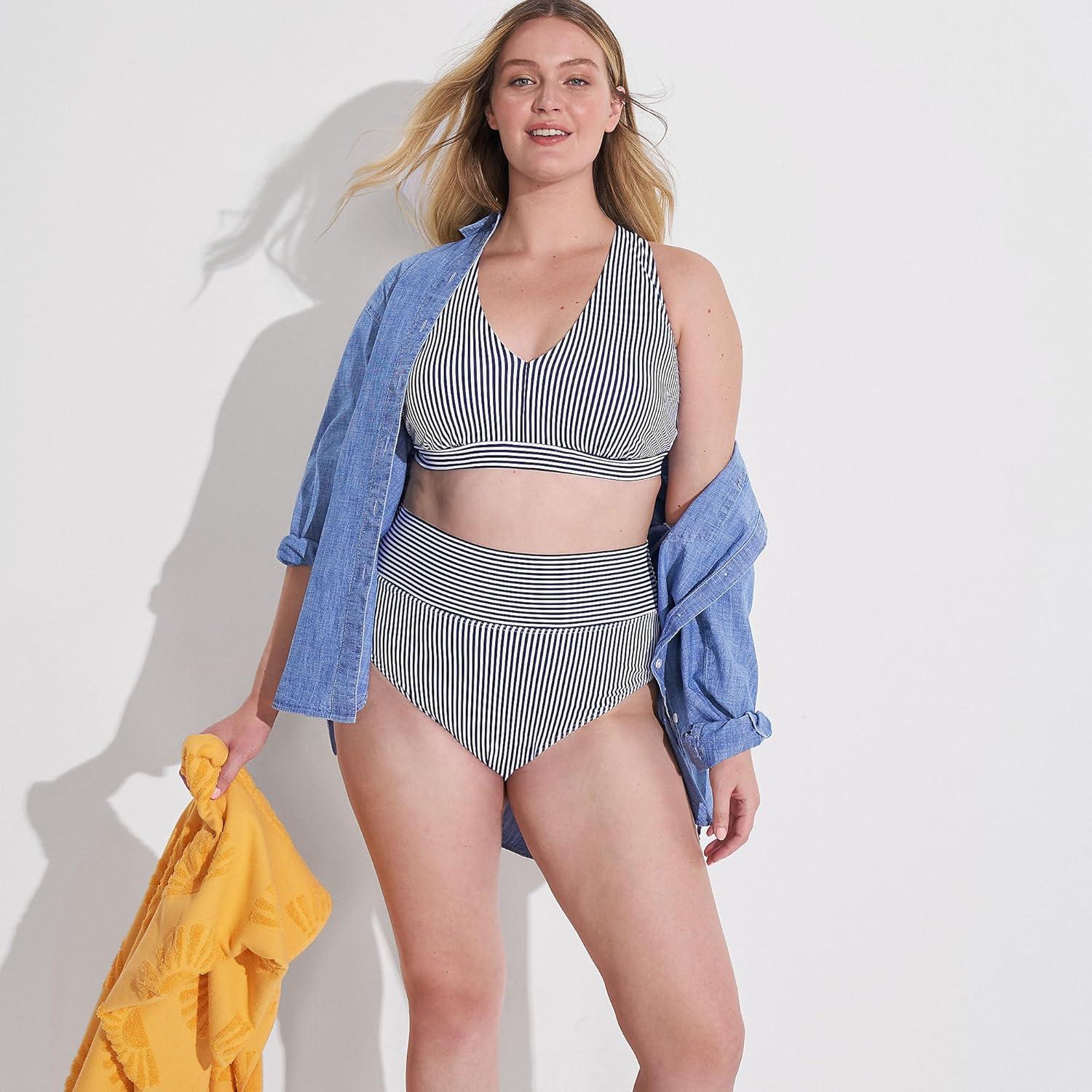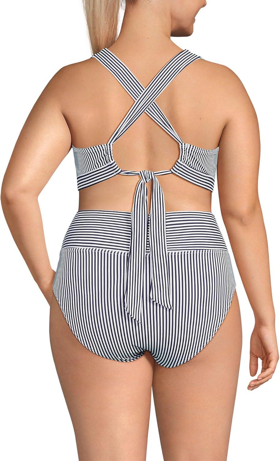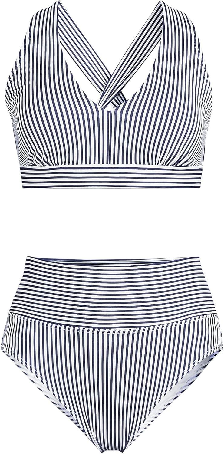 Lands’ End Women’s Chlorine Resistant V-Neck Midkini Swimsuit Top and High Leg High Waisted Bottoms 2 Piece Set(Deep Sea Navy Mini Stripe)