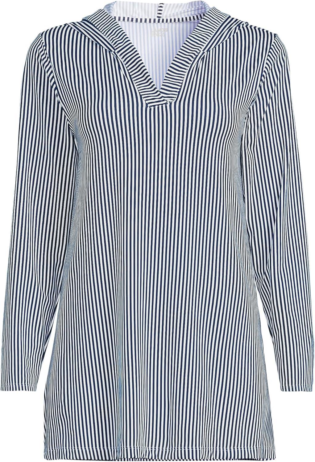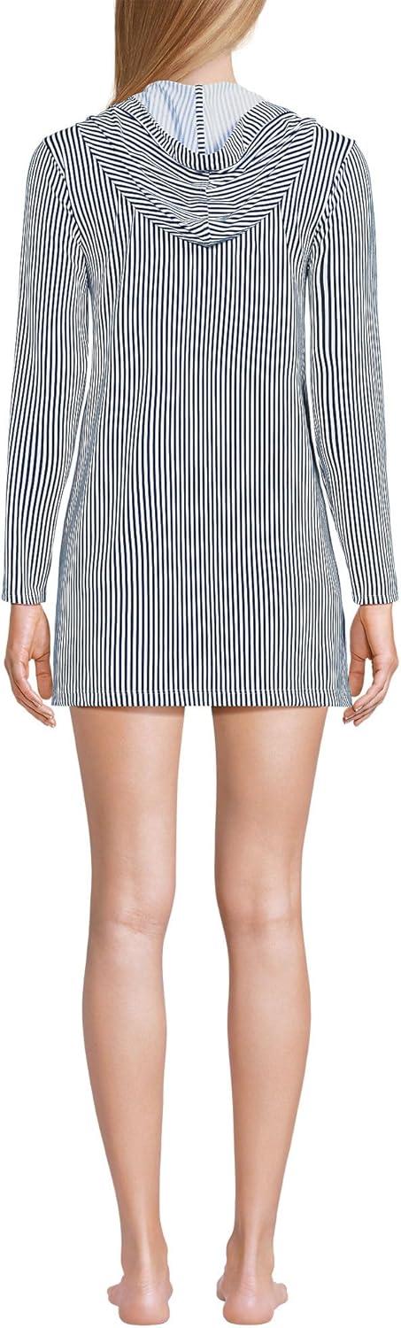 Lands’ End Women’s Cotton Jersey Long Sleeve Hooded Swim Cover-up Dress(Deep Sea Navy Mini Stripe)
