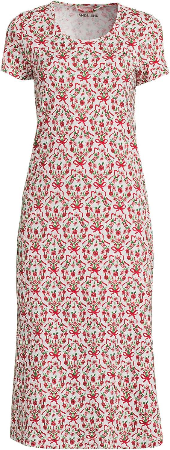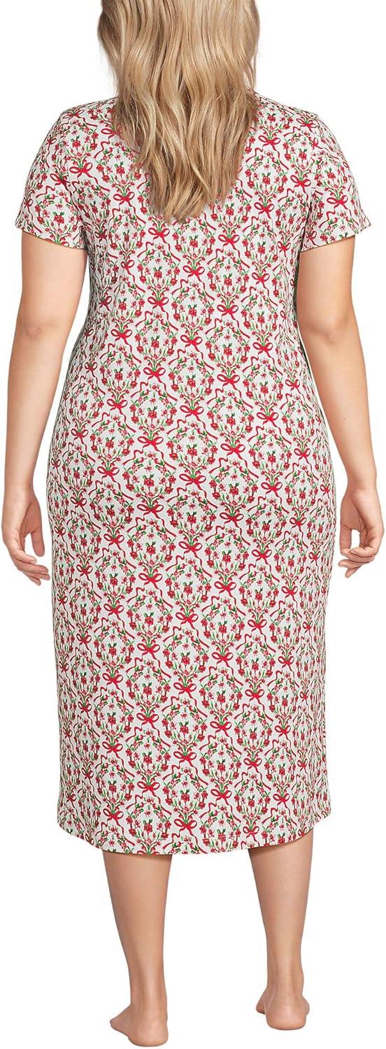 Lands’ End Women’s Cotton Short Sleeve Midcalf Nightgown(Ivory/Red Floral Wreath)