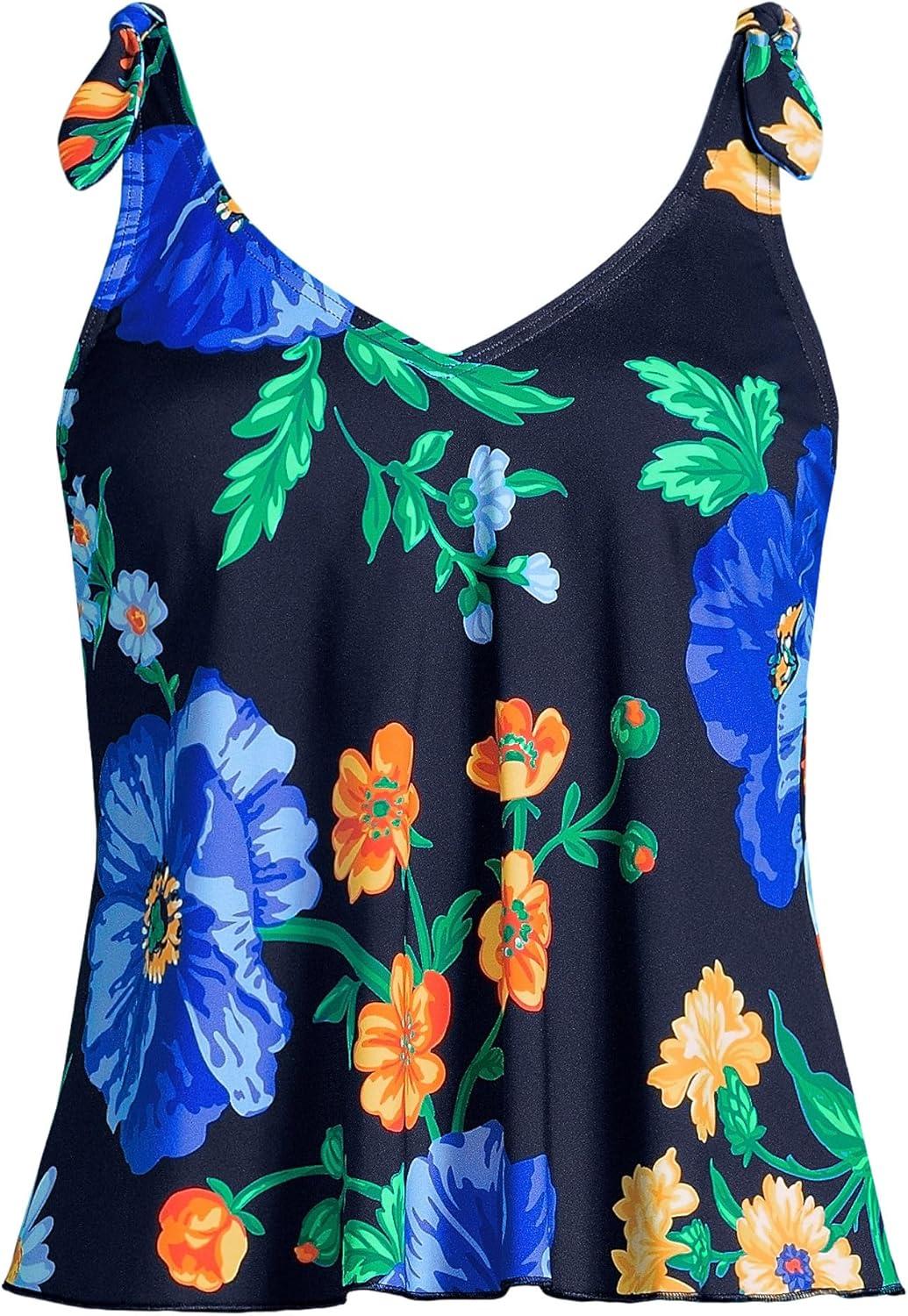 Lands’ End Women’s D-Cup Chlorine Resistant V-Neck Shoulder Tie Flutter Tankini Swimsuit Top(Navy/Exploded Poppy Floral)
