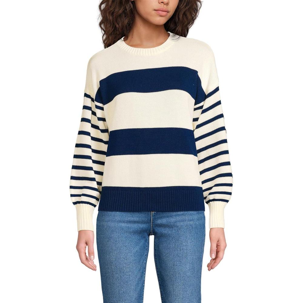 Lands’ End Women’s Drifter Jersey Crewneck Sweater(Navy/Fresh Ivory Wide Stripe)