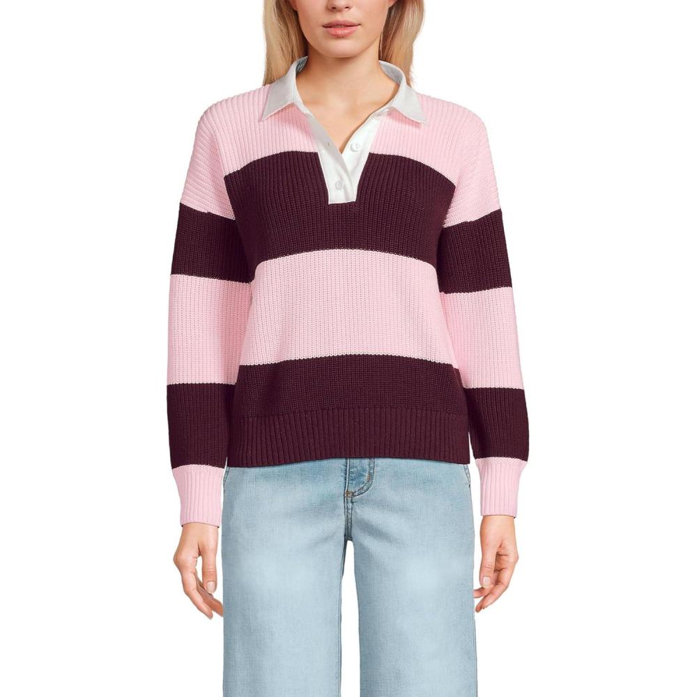Lands’ End Women’s Drifter Rugby with Woven Collar Sweater(Lush Burgundy/Pink Rugby)