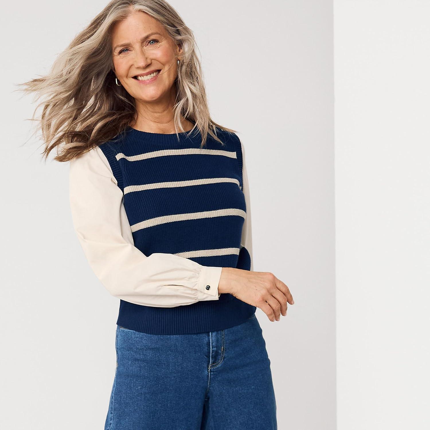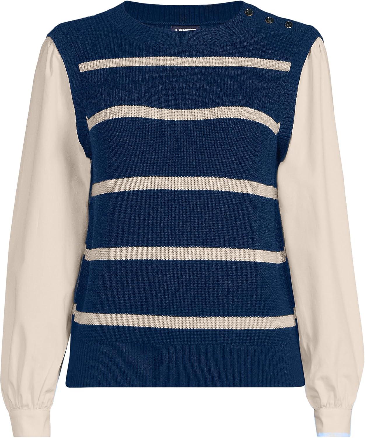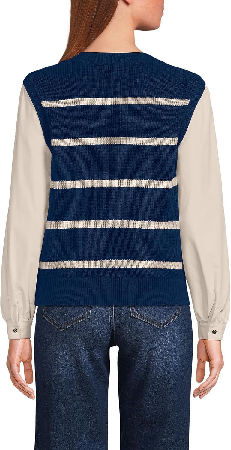 Lands’ End Women’s Drifter Shaker Button Shoulder Sweater Vest with Poplin Sleeves(Deep Sea Navy/Champagne Stripe)
