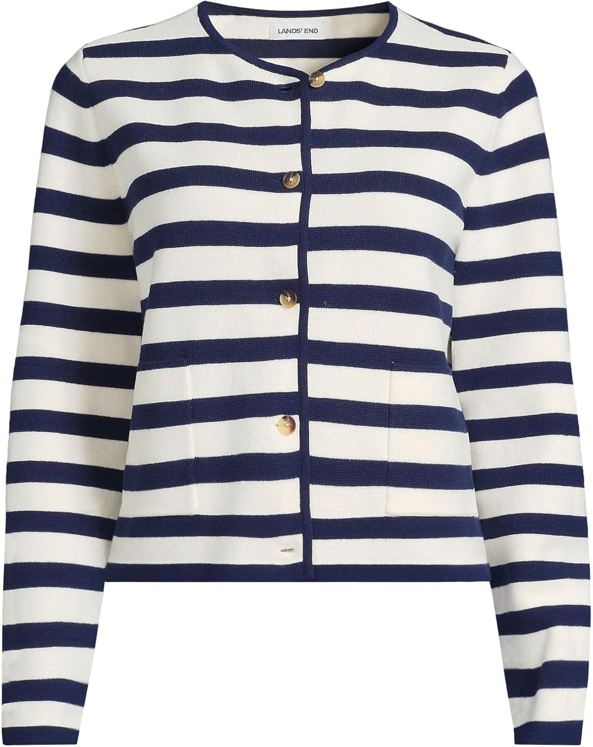 Lands’ End Women’s Fine Gauge Cotton Milano Blazer Sweater(Fresh Ivory/Navy Breton Stripe)