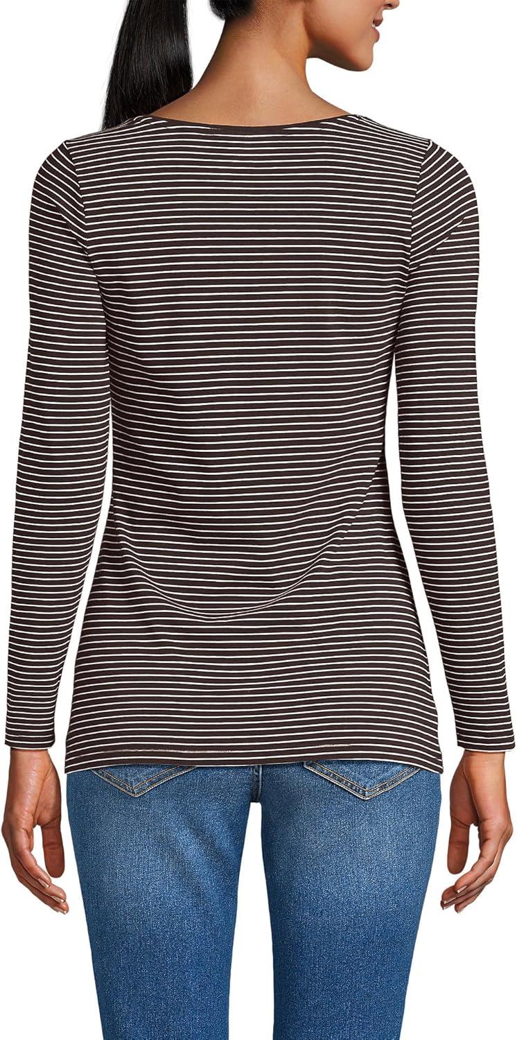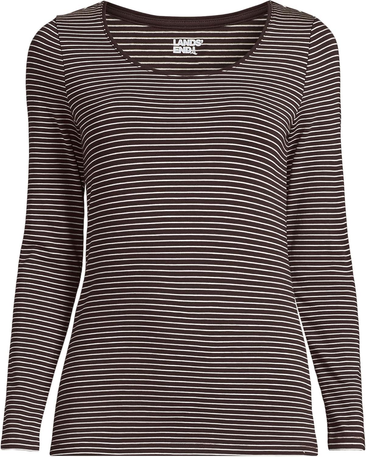 Lands’ End Women’s Long Sleeve Lightweight Jersey Scoop Neck T-Shirt(Rich Coffee Thin Stripe)