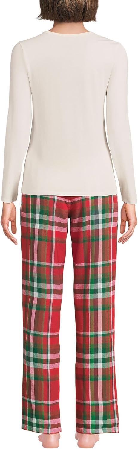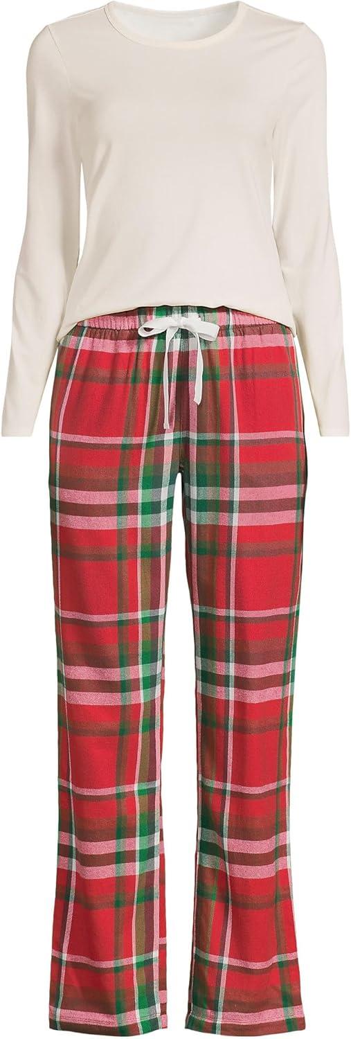 Lands’ End Women’s Pajama Set Knit Long Sleeve T-Shirt and Flannel Pants(Compass Red/Emerald Plaid)