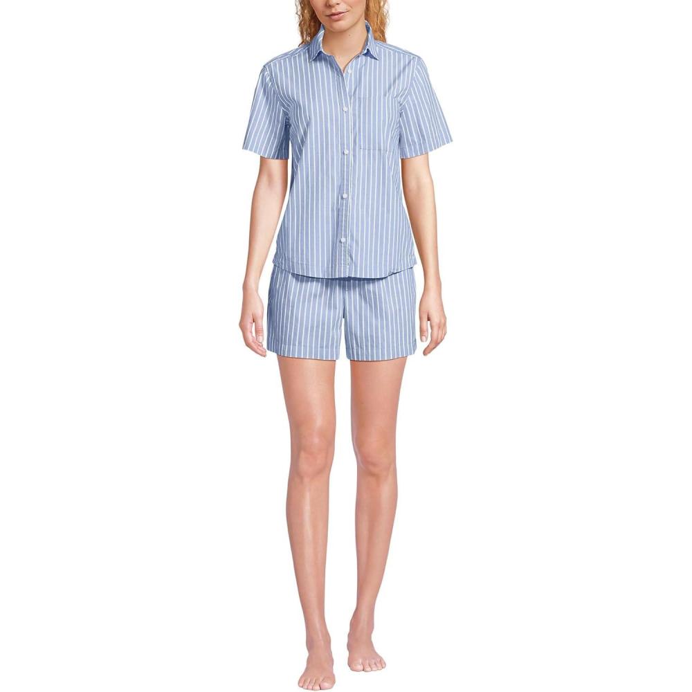 Lands’ End Women’s Poplin 2 Piece Pajama Set – Short Sleeve Shirt and Shorts(Crisp Blue Stripe)