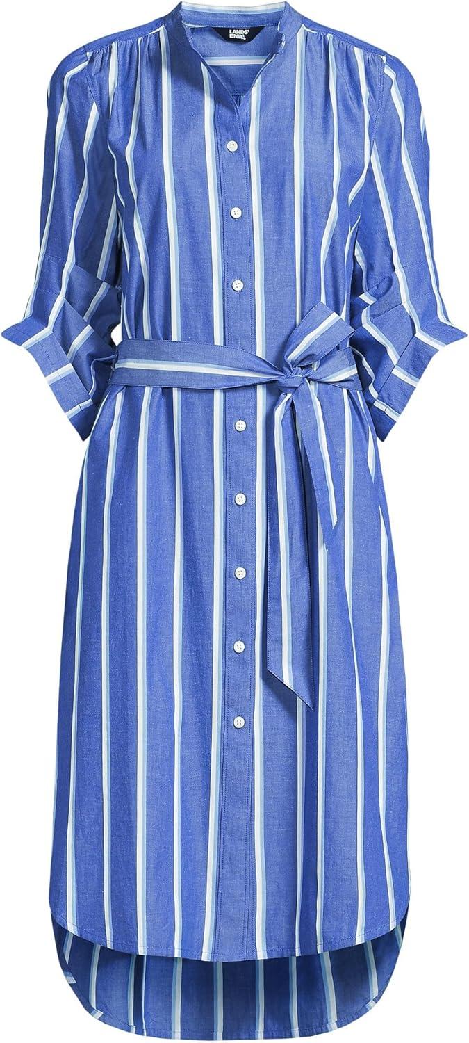 Lands’ End Women’s Poplin Oversized Puff Sleeve Midi Shirt Dress(Blue/White Shadow Stripe)