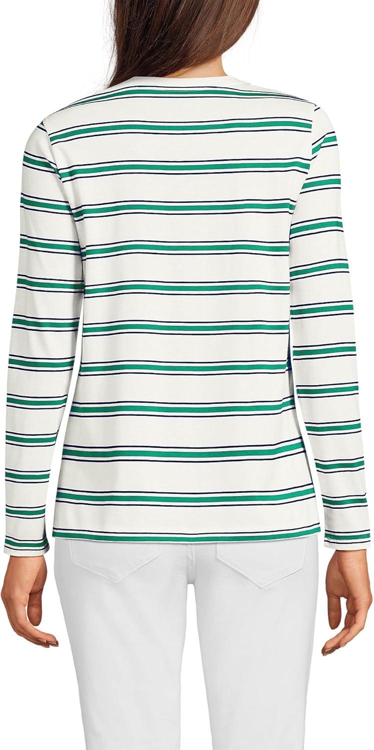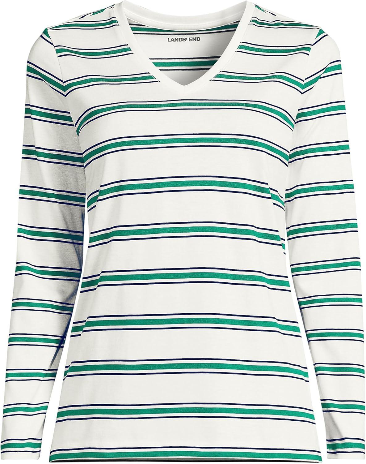 Lands’ End Women’s Relaxed American-Grown Supima Cotton Long Sleeve V-Neck T-Shirt(Ivory/True Green Stripe)