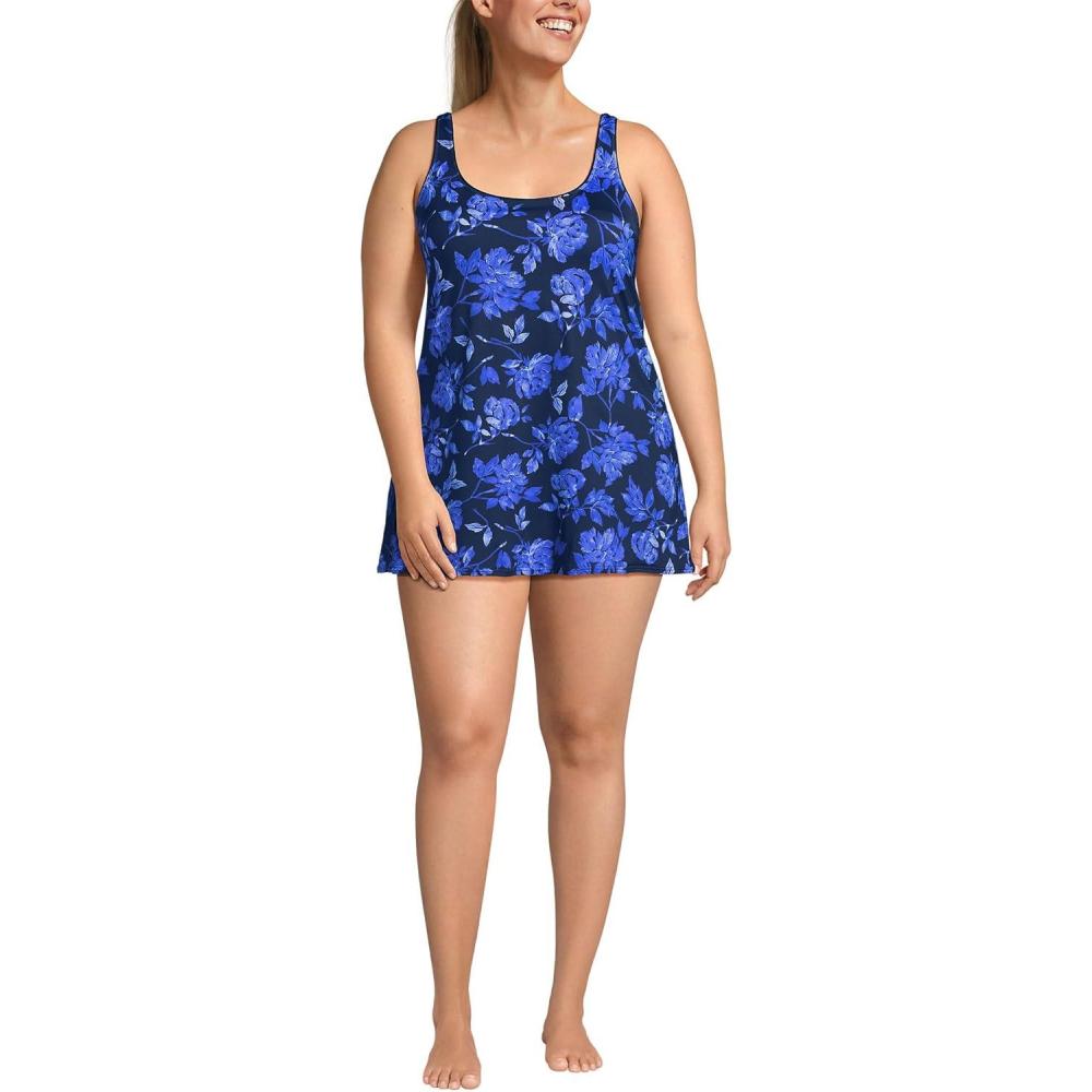 Lands’ End Women’s Scoop Neck Mini Swim Dress One Piece Swimsuit(Navy Graphic Floral)