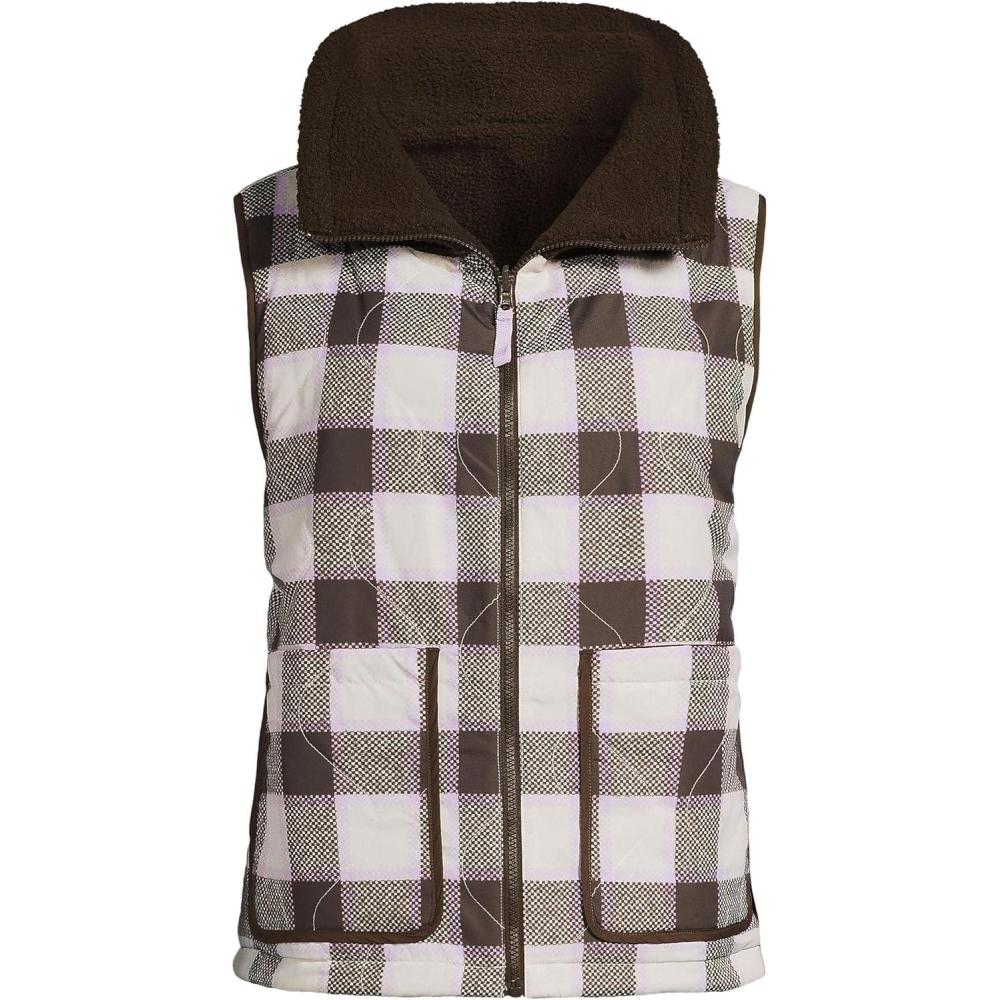 Lands’ End Women’s Sherpa Fleece Reversible Mixed Media Vest(Rich Coffee/Brown Check)