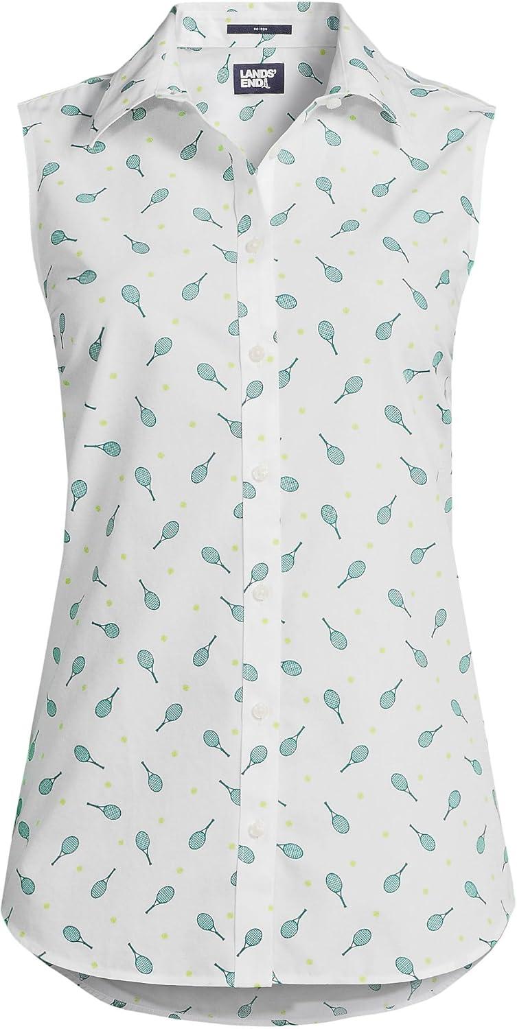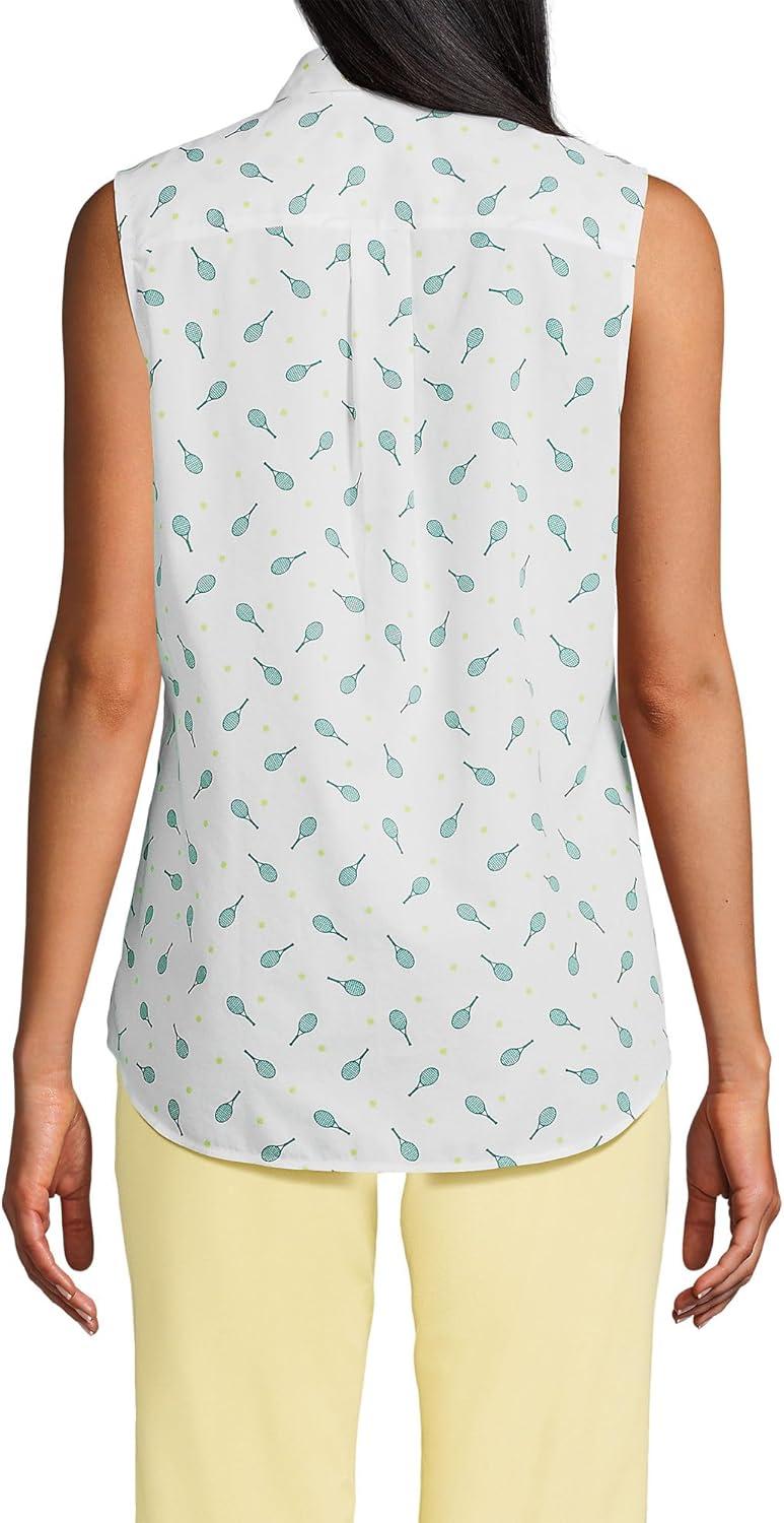 Lands’ End Women’s Sleeveless No Iron Shirt(White/Green Tennis Rackets)