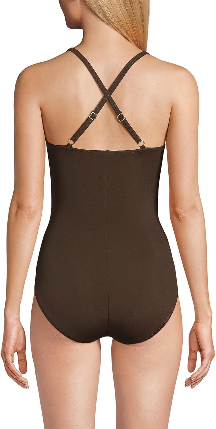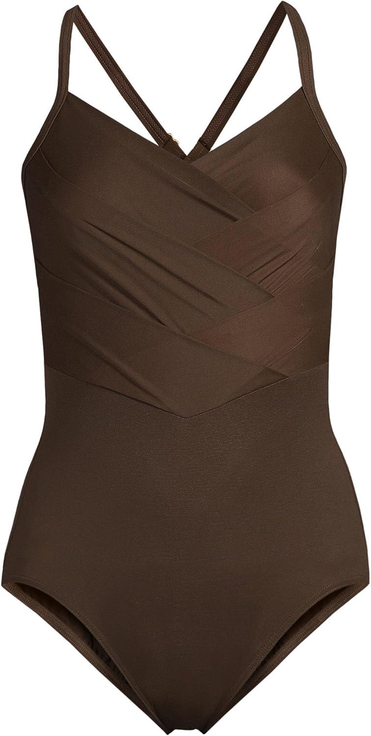 Lands’ End Women’s Slender Suit V-Neck Pleated X-Back One Piece Swimsuit Adjustable Straps(Rich Coffee)