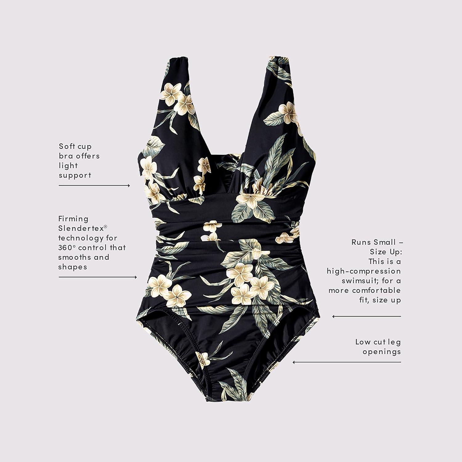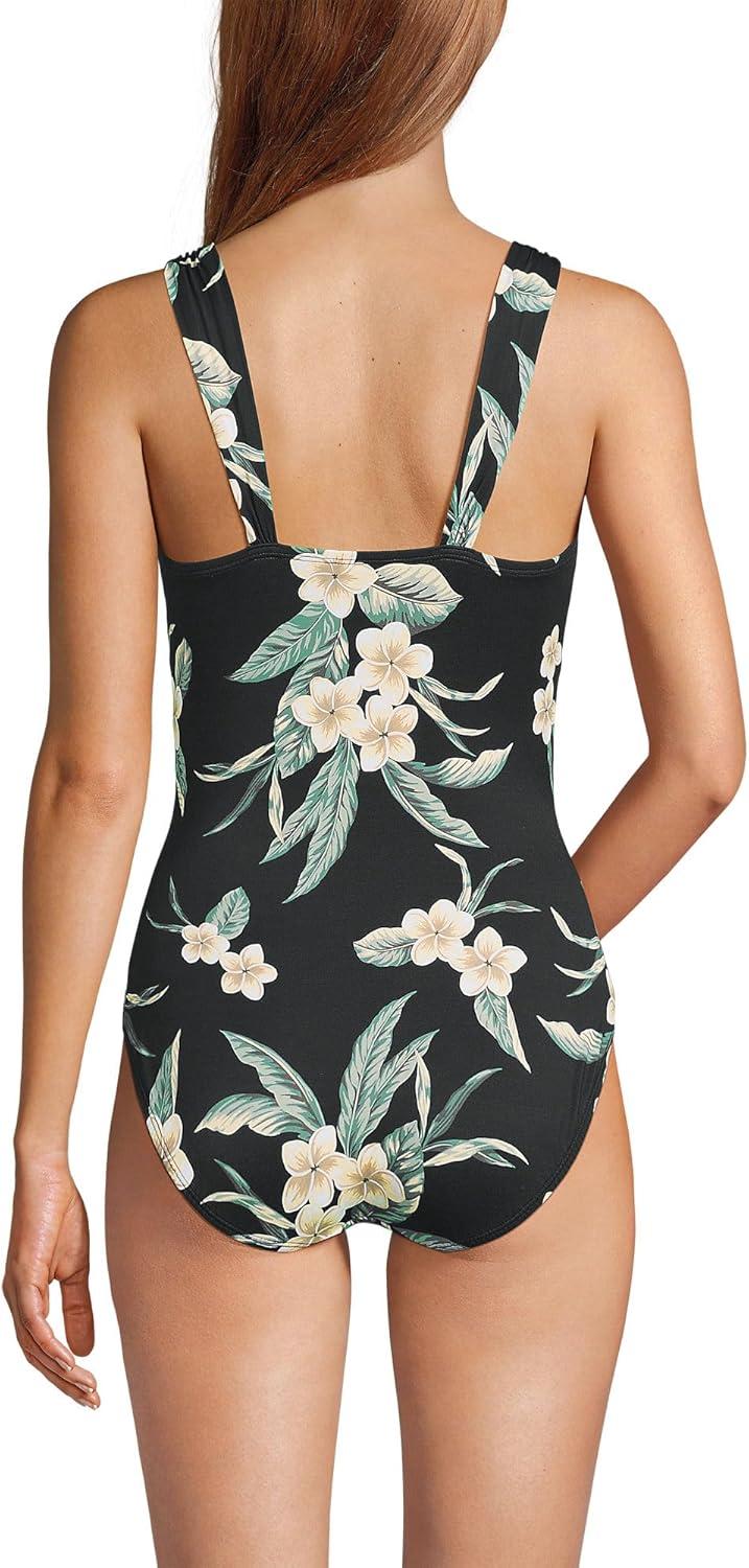 Lands’ End Women’s SlenderSuit Grecian Tummy Control Chlorine Resistant One Piece Swimsuit(Black Plumeria Floral)