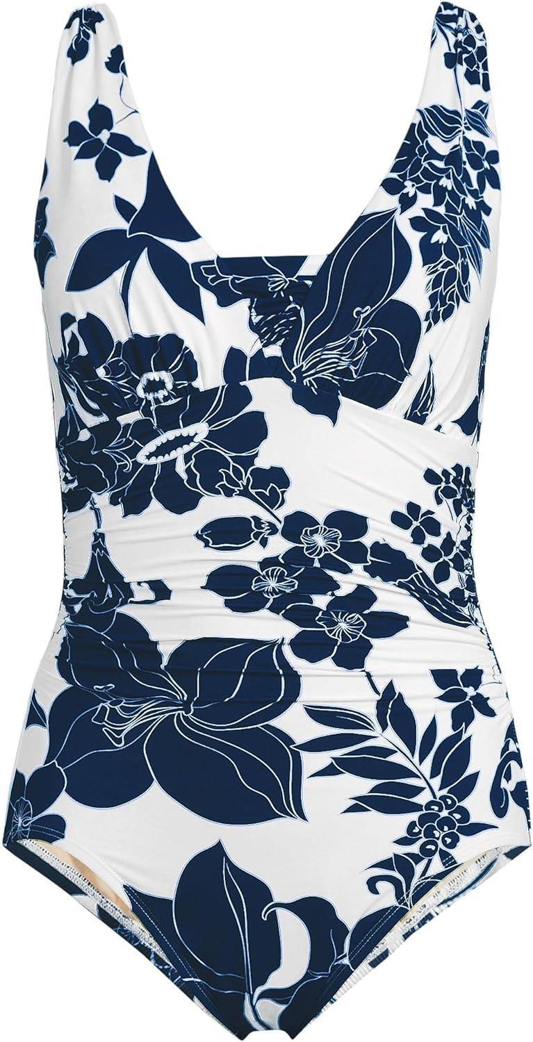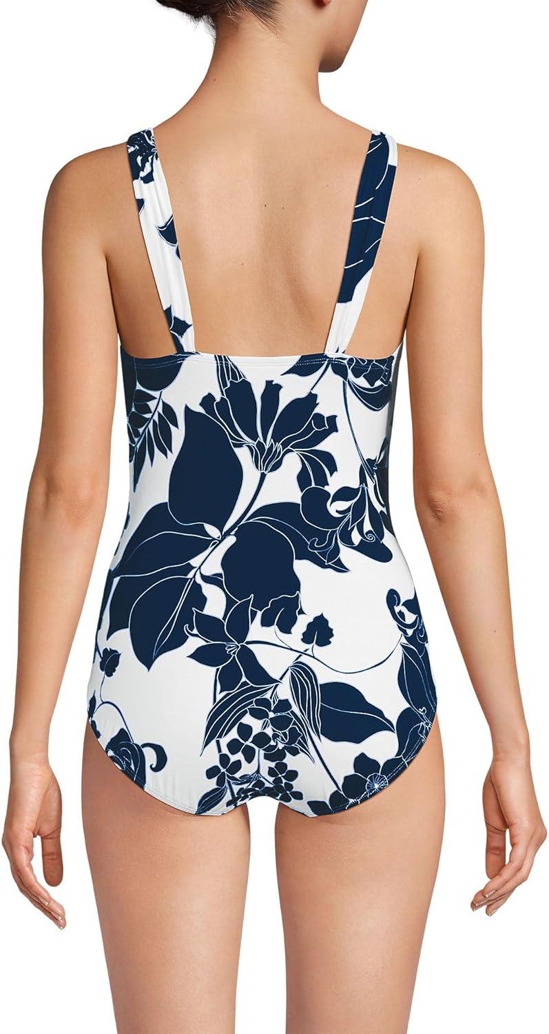 Lands’ End Women’s SlenderSuit Grecian Tummy Control Chlorine Resistant One Piece Swimsuit(White/Deep Sea Navy Lilies)