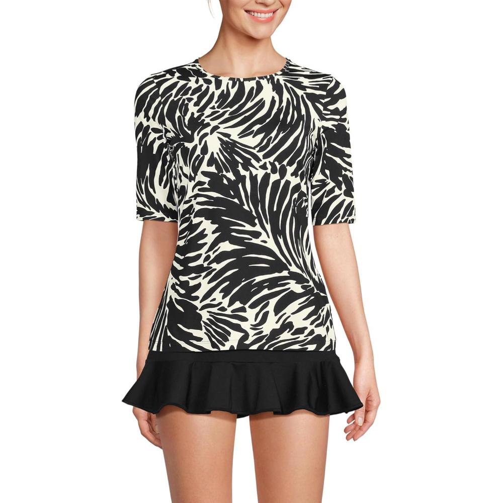 Lands’ End Women’s Sunshade UPF 50 Elbow Sleeve Rash Guard Swim Tee(Black/Egret White Leaf Scroll)