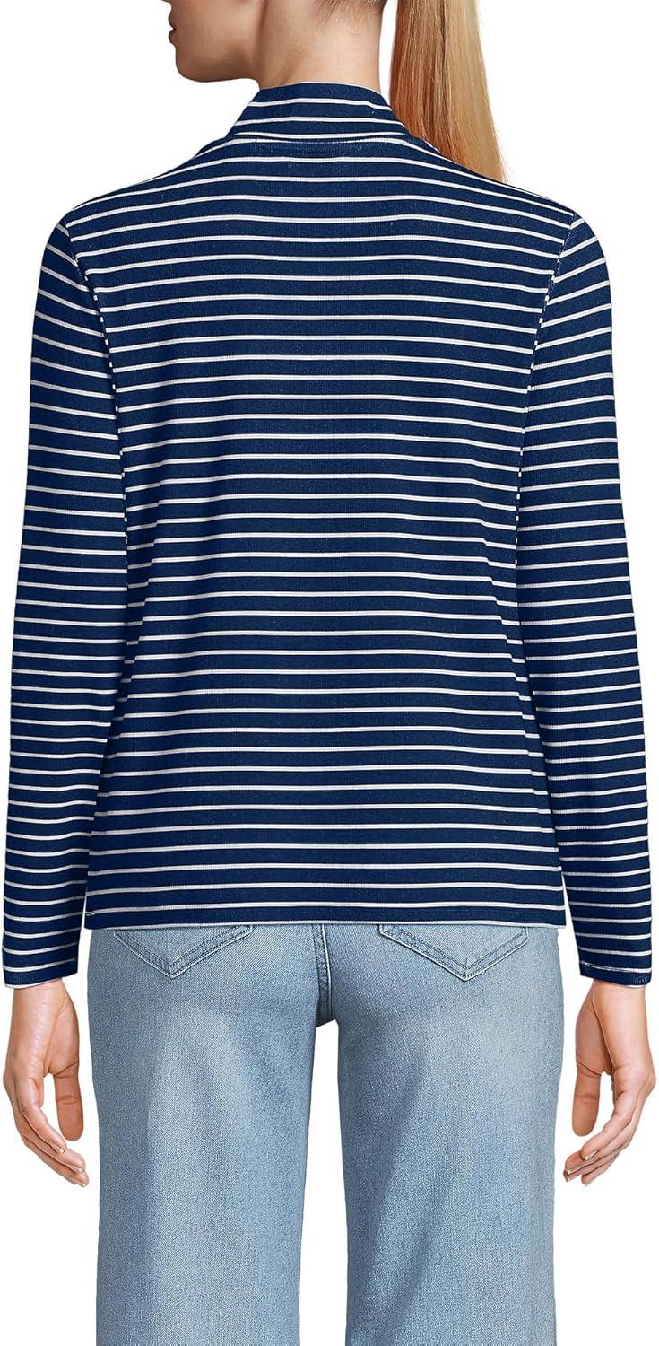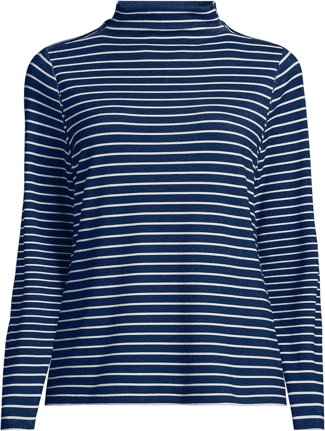 Women’s Drapey Rib Skimming Long Sleeve Mock Neck Shirt(Deep Sea Navy/Ivory Stripe)
